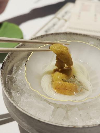 そして最も気に入ったお料理はこの店に来る価値を教えてくれたスペシャリテ。 大阪の夏野菜をふんだんに使用し多彩な調理法で作られた一言で表現するなら温かいサラダといったイメージ。 上にはサマートリュフのスライスを乗せとうもろこしのソースをかけ仕上げる。 ヤングコーンのフリット、八尾の枝豆、泉州の水茄子と一体何種類の野菜を使われているのだろう、この一皿だけの為に食べに来たいと思う程見事な逸品でした。 贅沢な茶碗蒸しフランは簡単なようだが実は奥深く鮑の肝と翡翠茄子旬の毛蟹が贅沢に乗る日本料理の様なきれいな味わい、 炭火焼きした瀬戸内のマナガツオは帆立のスープをベースに海水塩職人に作ってもらったという銀象ソルトのミネラル感と発酵アスパラの酸とのバランスが絶妙です。 メインのお肉は黒毛和牛のサーロイン(+¥3000)、脂の融点がとても低く熟成庫で4週間寝かせた旨みは舌の上で蕩ける極上の味わい、炭焼きしながら割下を塗るという手間で味の染みたすき焼きを食べているよう、日本のフレンチらしい和洋折衷でした。 ご飯もので出される揖保乃糸の最高級「三神」のじゅんさいを落とした艶めく麺線は食べるのが勿体無いほど美しくて美味しかった。
