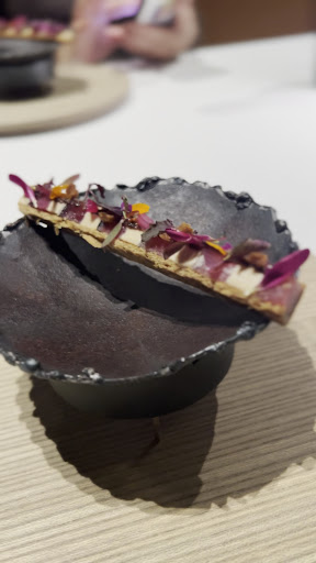 締めくくりは、濃厚なショコラのガナッシュに、ブルーベリーの酸味とローズマリーの香りを合わせたデザート。小さな一皿に詩的な余韻が込められており、食後の時間に優しい幕を下ろす。