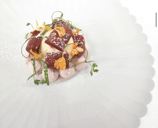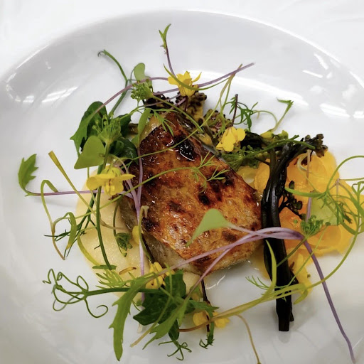 ■フェンネル(葉・株・茎)、発酵クリーム、キャビア 白と緑の2層構造になっている前菜になる。 地中海原産のハーブであるフェンネルと発酵クリームの2層、 粉状のモノはフェンネルの種、ほろ苦さと香りが前菜にピッタリ。 ■北海道産板マス、鳴門オレンジ、豆 50~60㎝になるという巨大なマスを使用した逸品、 瞬間燻製した香りをまといふくよかな味わい これはワインが進んで仕方ない。 今日も沢山飲む予感しかしない(*'▽') ■静岡天竜金目鯛、堺菊芋、自家製ピスタチオ味噌と実山椒 店主は味噌を手作りしているようだ。 空豆など数種、これはその一つを使った料理、 パリッとした皮目と旨味の詰まった金目鯛の身が極上の美味さ。 ソースは堺の菊芋と金目鯛のあらを使っているようだ。 そりゃ美味いはず。