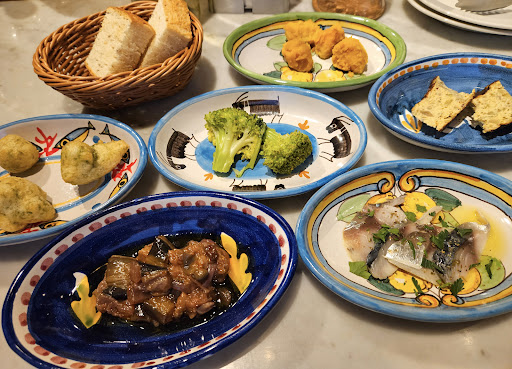 シチリア料理に特化したイタリアンの店です。大阪のイタリアンの中でも、南部イタリア料理の店というのは多くないですが、シチリア料理の店も何軒かありますが、ここまで本格的なところはないのではないかと思われます。イタリア料理と言えば、アンティパスト(前菜)、プリモピアット、セカンドピアットと流れていくんですが、南イタリアではまず小皿料理を複数提供しくれます。これがメインに匹敵する分量で、その後はパスタで締めるという形になります。小皿料理が並ぶと言うことで、スパニッシュのタパスとも関連があるのではないかと考えているのですが、勉強不足なので、よく分かりません。