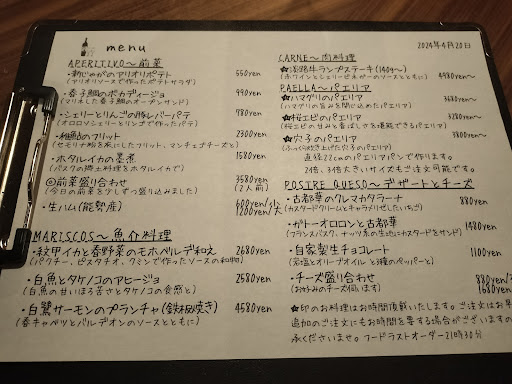 基本はアラカルト。メニューは少なめです。 ・前菜の盛り合わせ キタアカリのアリオリポテト レンコンと紫大根のビネガー アン肝のキャラメリゼ 稚鮎のフリットとチーズ 春子鯛のボガディージョ ・紋甲イカと春の山菜のモホベルデ和え 2,680円 ・白魚とタケノコのアヒージョ 2,380円 ・淡路牛ランプステーキ ・富山県産ホタルイカのアロスネグロ 2,980円 ・対馬穴子のパエリア 3,800円 ・ガトーオロロンと古都華 1,680円