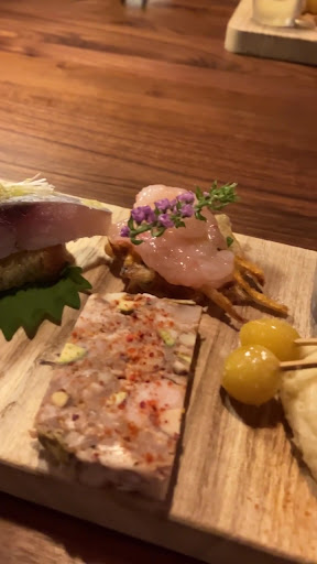 【呑んだもの】 ・ハートランド 生ビール 650円 ・オ ルアール ド シル ゴデージョ 7000円位 ・クロ レオ 2020 15000円位 ・ノーブル ヴァインズ 667 ピノ ノワール 2019 7000円位 ・サントリー角 水割り 650円 ☆前菜盛り合わせ2人前 ぎんなんポテト・白金豚のバスク風パテ・ピオーネとフルーツトマトのガスパッチョ・トルティージャ デ カマロネス・鯵のボカディージョ の盛合せ