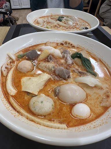 本格マーラーの味をしっかりと堪能できる一品。 今回麺は細いストレート麺を選択しましたが、大正解😊しっかりと味が染み込み絡んでいます‼️ そして具材も魅力的な食材は全て入れちゃいました😍豪華な海老、牛、野菜🥬それぞれの旨みがしっかりと閉じごられていてめっちゃ美味しかった🥺 また、蟹味噌入り団子はめっちゃおすすめ! モッチモチの生地にしっかりと蟹味噌が入っていてなかなか日本では味わえない団子✨色もオレンジと白で鮮やかで可愛かった😋❤️🔥