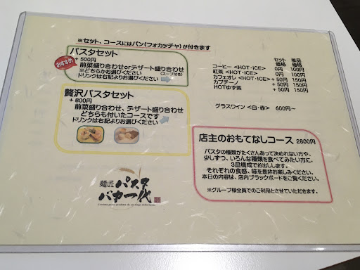 色々とあるけど、平麺のパスタに目がいく。 同行者もどうやら平麺狙いのようだ。 お互いに食べたいものが、同じ感じやったので、せっかくやから2種類頼んでシェアすることに。 あと、セットもお得そうなので、セットもつけよう。