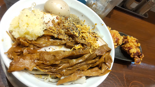 さて、てんじろう。 事前情報無し、店頭のメニューだけで決定。 …二郎系、とは、少し違うか? いわゆる、汁なし。まぜそばとの違いは不明。 大量のメンマ、その下に隠れるモヤシとキャベツ。チキ☓ラーメン?チャーシューにニンニク。…魚粉…混ぜなきゃ、ダメよね?
