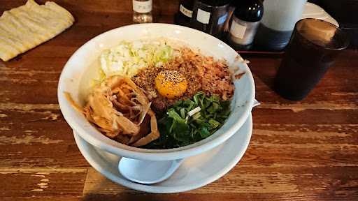 香辛料はわずかに胡椒が香る程度、オリーブオイルが加えられているとのことですが油はさほど感じません。生卵のコクがいい仕事 麺はつけ麺と同じ中太平打ち、コシと弾力が好み。粉の風味はちょっと遠め 塩気もちょうど良く、そのままでもご飯と一緒でも食べれます 突出した何かがある訳ではなくパンチは弱いのですが、それだけに安心する美味しさです お昼に伺ったのでご飯が無料、麺と一緒に一杯、残った具材で一杯いただきました 昼営業の終わり間近だったのでお釜のご飯が少なく、乾き気味の固さでしたがギュムギュムな歯応えがかえって私好みでした