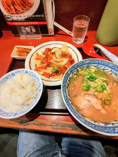 酢豚食べたい・ラーメン食べたい、ってことで「ハーフラーメン酢豚セット」をラーメン並、ご飯大盛注文。おっさんになっても食べ盛り(笑)。 ※ラーメンの種類選べます、と言われて全体のバランス考えて「塩」にしたが、 昔の味を朧気に思い返してみても味が薄くなった気がする。洗練感は無く・・普通。 ※酢豚、甘さ控え目でボリュームはある。 ※付け合わせの揚げ餃子、普通。