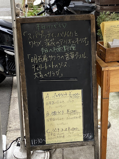 A:パスタランチ(前菜・パスタ・パン・ドリンク)1000円 B:平日限定お魚ランチ(前菜・魚料理・パン・ドリンク)1200円 C:ランチコース(前菜・パスタ・魚料理・パン・ドリンク)1800円