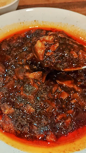 *料理 ・激辛麻婆ランチ ランチを注文すると蒸し鶏、卵スープ、塩漬けザーサイ、ご飯がセットでついてくる。 激辛と書いてあったので覚悟していたが・・あれ、辛くない?と思いきや、舌に走る強烈なシビレ。わたしの舌はポケモンでいう終始マヒ状態。とはいえ唐辛子の辛さはそこまでないので辛いものがあまり得意でなくとも食べられるかも?(麻:8/ 辣:2くらい?) 見た目はオイリーだけど重たい感じではなく、味はコクがあって濃厚。すこし味が濃いのでご飯と食べてちょうどいいくらい。味の濃さ的に二人で2種類セットを注文して、シェアして食べるくらいがちょうどいい気がする。セットについている蒸し鶏もプリっとしていておいしかった。