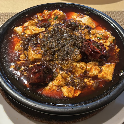 四川麻婆豆腐は土鍋で提供。 目の前でふたを開けてくれる、ぐっつぐつのやつでした。
