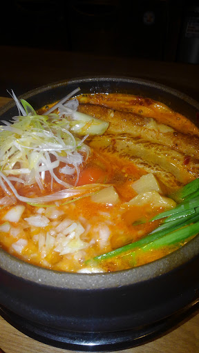 今年の8月に吹田にオープンし、気になっていたチゲラーメンの専門店《元祖石焼チゲ旨辛ラーメン専門店 JanJan》さん。 チゲラーメンとはなかなかニッチに振り切ったお店。茨木にある系列店《新羅豆冨茨木店》の人気メニュー『スンドゥブ純豆腐』がかなり好評なので、その特製旨辛味噌ジャンを看板メニューとして専門店化したそう。 そのうち行こうと思っていたら、10月末には上新庄にも2号店がオープン!勢いがすごい! ということで気になって仕事帰りにサクッと訪問。 入店すると、お客さんで賑わいをみせる店内。 特に女性比率が高いよう。 ベースは赤味噌ジャンと白味噌ジャンの2種類で、それぞれ『和牛』『ポーク』『チャーシュー』『海鮮』がラインナップ。 左上の法則に従い、『名物!!旨辛!!和牛ホルモンチゲらーめん』を注文。 しばらく待っていると着丼〜