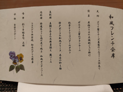 美味しそうな料理名と食材の和風フレンチ会席でしたが、見た目は美味しそうに見えますが、正直味は大したことありません。それなのにドリンクの値付けだけは少し高めで、微妙です。。ほとんど出来合いのものをだしてるだけですし、トリュフバターやポルチーニ茸なんて、香りが欠片もしなかったのは、笑いそうでした😅あんなに香りが高い食材の存在感を消せるなんて、ある意味達人技ですね🤔 手毬寿司なんて冷蔵してたからか、固かったですし😩 そしてデザートの際の紅茶、コーヒーは別料金です(笑)こんな料理出しておいて、そこも有料なのはもう笑うしかありません。