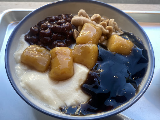 Read moreこの日は猛暑日で冷たいスイーツが食べたくなり夕方から天六に上陸!そして向かったのが大阪市北区本庄東にある人気台湾スイーツ専門店『南所豆花』さん。 場所は天神橋筋六丁目駅11番出口から北西方面に 歩いて6分ほどの閑静な住宅街にあるマンションの1階にあるお洒落な路面店です。 16時頃到着すると並んでるお客さんは皆無ですが 店内で食事をしているお客さんが6名いました。 店名の通りメニューは「豆花」がメインですが サマーシーズンはマンゴーかき氷などのかき氷も 販売しているそうで結構人気のようです。少し迷いましたが「豆花」を食べた事がなかったので「南所豆花」をお願いしました。 ◉南所豆花 ¥850 ※4種類のトッピングが無料 小豆・さつま芋団子・ピーナッツ・仙草ゼリー 店内にはイートインが可能な相席用のテーブルと 窓側にカウンター席があり私はカウンター席でいただくことにしました。 店内はスタイリッシュでお洒落な空間で私のようなオヤジはちょっと浮いていたかもしれません(笑) 南所豆花は白い陶器のボウルに豆花がたっぷり入り小豆,さつま芋団子,ピーナッツ,仙草ゼリーがトッピングされていて一緒にシロップが添えられていました。そしてシロップをかけて頂くととても滑らかな食感でシロップも優しい甘さでトッピングも異なる食感でいいアクセントになっていて最後まで飽きずに美味しくいただくことが出来ました...