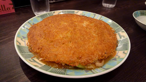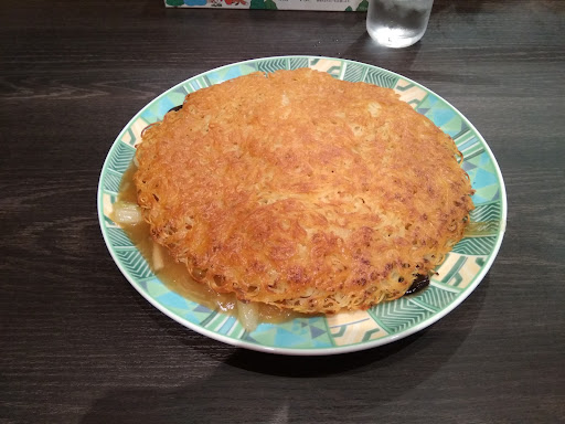 五目炒麺 中華丼のように上から餡かけしてるのとの逆で、八宝菜の餡かけの上にフライパンでカリカリに丸く焼き固めた麺で蓋をした感じ。見た目は素っ気ないけど...
