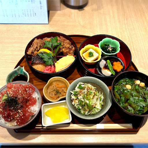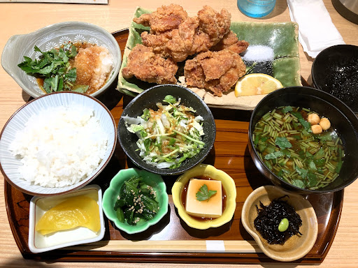 出汁巻きやマグロを使ったランチが気にはなるものの、個人的に揚げ物でお店の良さを確認する癖があるものだから「塩竜田揚げ定食」をオーダー。約20分かかるが、これがしっかり2度揚げしてくれる上に副菜もこの通りで準備に時間がかかるのは致し方無い。