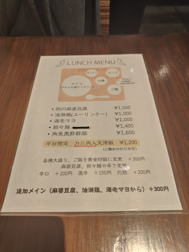 着席して、躊躇いなく麻婆豆腐ランチ(1000円)をオーダー。 辛さを増やせるみたいだったので、店員さんに辛口・激辛・灼熱の3つのうち真ん中の激辛について、「辛いもの好きなんですけど、激辛ってめっちゃ辛いですか?」と質問したところめっちゃ辛い、とのお返事😅