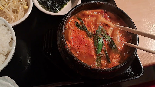 スープはさほど辛くなく、甘みとコクがあります。美味しい。やや豆腐が少ないかな。 もやしのナムルや韓国海苔が良い箸休めになります。 ヘルシーで満足感もあり、いいランチとなりました。