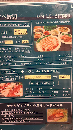 混雑の時間帯だったので人手が足りていないのは理解できます。 まず席に着いてメニューを広げると手にベタベタしたものが付いて不快だった。メニュー表紙にタレが付着していた。席の掃除の際はメニュー表紙も拭き上げて中も確認することを店側にはオススメします。 流行りのQRコードを読み込んで自身のスマホから注文する形式ですが、これが面倒くさい。LINEの友達追加しないと進まないののが嫌でした。時間経過すると、またQRコード読み込んで頼まないと駄目。メニューも見にくく探すのに手間取った。店側が用意するタブレットのほうが見やすく早いし助かるのに困りました。 注文の肉は早く提供されて嬉しかったのですがサイドメニューが本当に来ない!白米と肉を食べたいから一番に白米注文してるのに20分待っても来ない…お肉は次々に来るが子供が御飯ほしいと呟く。待っても来ないので「すいません、子供に先に御飯おねがいします」と伝えると「混んでるからねぇ」と返される。混んでるのは理解できるが白米に20分は待たせすぎでしょ…日本人の店員さんは提供のお皿の置き方も音を立てずに丁寧です。言葉も柔らかいし丁寧な接客ありがとうございました(๑´ڡ`๑) コンロの火も弱くて焼けるのが遅い。食べ放題の時間を稼ぐためなのかと邪推してしまった トイレは個室が二つで清潔感があったが便座の暖房機能がオフになっており真冬に覚悟もせず座ってしまいヒッと声が出た(笑)掃除の際に触れば冷たいの分かると思いますが残念です。