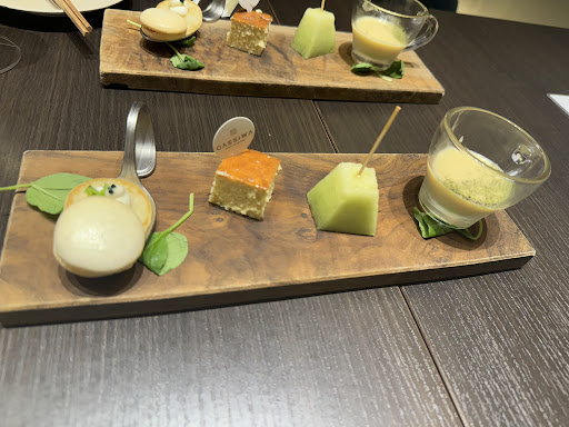 次に料理が提供されてきます! ・フォアグラ最中マカロンのような一品が登場!実はモナカ!サクサク最中の中には、世界三大珍味の「フォアグラ」がたっぷり!濃厚で、旨味あり意外と最中のほんのりとした甘みと好相性!1人1箱提供!
