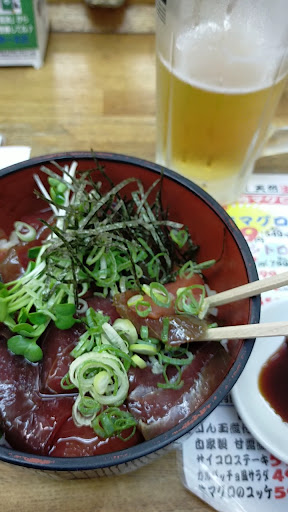 2023年夏、追記。 私がこの店に通いだしてから7、8年経つ。初めて店に入った時、その人の多さと賑わいに驚き、マグロなど刺身の安さと旨さ、ビールなど酒類の安さに驚愕したものである。一週間仕事が出来るのはビール一本を飲み干しもう一本頼みたくなるこの店の持つバイタリティーに乗せられる心地良さにあったと今でも思っている。令和の現在に至る迄、確かに様々な事が過ぎ去ったのも事実である。酒類、魚の値上げも大きい。一番大きいのはコロナであったかと思うが、少々の値上げと質、量の減少は仕方なく吸収してきた、いや、吸収出来る範囲であったと思う………。 今日、久しぶりに暖簾をくぐった。海鮮漬丼。青魚などが切れていたので、マグロ漬丼になって出てきた。漬液に漬かっているので分かりにくいが明らかに鮮度が………。月曜だし、土日明けで市場が休みだったのかも知れない。でもあれは出してはいけない。しかも値段は100円上がっている。 気付かない内に、私の桃源郷ではなくなってしまっているのかも知れない。確かに、お客さんの数がびっくりす...