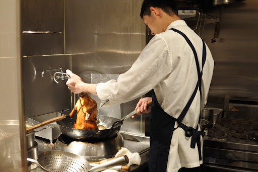 この店では調理が目の前で見れるので特等席と言えます^ ^ まずは紹興酒で乾杯してコースのスタート。