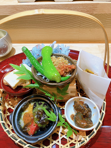 ⚫︎おつまみ •万願寺とうがらし、しらす、じゃこ、金山寺味噌 •数の子バター、パン •水茄子、帆立、トマトジュレがけ •サザエキムチ •そら豆チップ