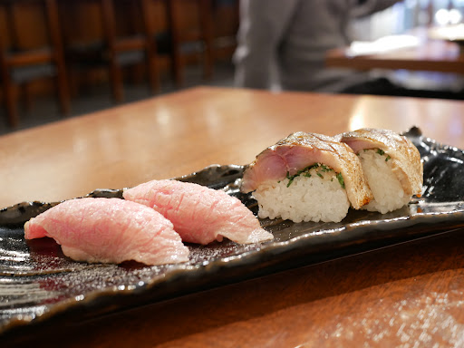 アテ盛りは4人で一つを注文しましたが、美味しくてパクパク食べたので2人で一つくらいが良かったかも!? 刺し盛りは10種類の盛り合わせで、特にサワラの炙りと縞鯵が美味しかったです。 名物の鯖寿司と肉握り寿司は見た目も味も抜群でした。 明太だし巻きもジューシーで良かったです。