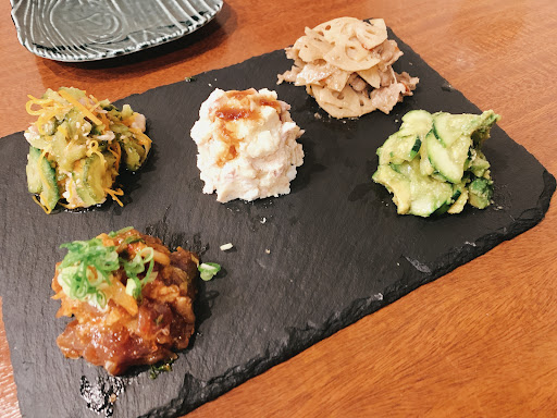 おばんざい5種盛り →メニューにある5種が来ました(´▽`)/ ・ローストビーフのポテサラ ・漬け鮪のキムチ和え ・百合根と海老の梅和え ・白菜とささみのコールスロー ・蓮根と和牛のきんぴら 注文したメニュー待ちながら ちまちま酒飲みながらつまむのに最高です♪ 前菜なので味が濃すぎないのも良かったです! 全員好きなのはローストビーフのポテサラ笑 これはずるいw ウマイニキマッテル(*゚▽゚)ノダヨネ~♪