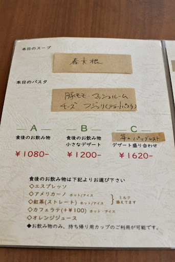 A:スープ+パスタ+ドリンク 1080円 B:スープ+パスタ+ドリンク+デザート小 1200円 C:スープ+パスタ+デザート盛合せ 1680円