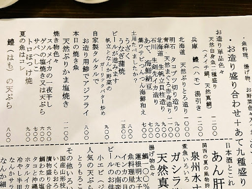 到着したのは16:00過ぎだったのだが、他に客はいなかった。トリビー(とりあえずビール)を飲みながら、メニューを眺めるわけなのだが、作り盛り合わせ+あて九種盛り(2,800円)というのがあったので、そちらをオーダーしてみた。作りもあても、ごく普通だと思う。