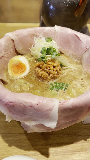 Read more🍜麺スタイル林🍜 六甲道の肉スタイル林さん🍜 富雄の鶏スタイル林さん🍜 に続いて本家の 麺スタイル林さんに行ってきました🍜 夜の比較的遅めの時間でも行列が出来ていて、15分ほど並びました🚶 店内はムードのある雰囲気でオシャレなJAZZが流れていました🎵 カウンター席とお店の奥に座敷があり、2階にもおがあるようで、カウンター席に行かせていただきました😄 目の前で調理される姿を見れるのは楽しかったです✨ ラーメンの種類が多くて悩みましたが、 肉まみれスタイル味噌🍜 とご飯もので 半熟玉子天いくら飯🍚 を注文しました🍜🍚 肉まみれスタイル味噌🍜 着丼したラーメンはめっちゃ豪華でした🍜 濃厚な味噌スープ 中太麺🍜 花びらのようなたっぷりのレアチャーシャー🐷 肉味噌🐷 味玉🥚 長ネギ 炒めたキャベツともやし🥬 かいわれ大根 木の芽 とめっちゃ豪華で綺麗です😍 美味しいお召し上がり方も書いていて、それに沿って食べました🍜 まずスープを飲みましたが、とろみがあり、めっちゃ濃厚でいろんな味が複合されて、野菜炒めの香ばしい香りも合わさりめっちゃ美味しかったです😍 少しピリ辛の風味もあり、飲んでも飽きが来なかったです😊 中太麺もスープに絡んでめっちゃツルツルで美味しかったです🍜 麺にスープがたっぷり絡んでめっちゃもちもちで美味しかったです🍜 レアチャーシャー🐷 器にたっぷり花びらのように飾られていてめっちゃ綺麗でした🐷 そのままでも美味しくて、スープにつけてもまためっちゃ美味しかったです🐷 炒めたキャベツともやし🥬 焼き目が覚め香ばしくて、食感もシャキシャキでめっちゃ美味しくて、スープとの相性も、バッチリでした🥬 肉味噌🐷 食べた方にも途中でほぐして食べました🐷 スープがよりマイルドになってまた違う美味しさがありました✨ お肉も食べ応えがあり美味しかったです🐷 味玉🥚 黄身の色が濃くて、めっちゃ美味しかったです🥚✨ 濃いスープとの相性も最高でした✨ 長ネギ かいわれ大根 食べている時の食感がシャキシャキで、アクセントになって美味しかったです😊✨ 木の芽 ラーメンの具材として木の芽を初めて見ましたが、木の芽の風味が好きなのでいい風味が出て美味しかったです🌱 めっちゃめっちゃ美味しくて、スープもほとんどなくなるくらいでした🍜 あまりに美味しくて、辛子ニンニクをお願いするのを忘れてしまいました😂 次は絶対お願いします‼️ 半熟玉子天いくら飯🍚 いくら かつお節 大葉 半熟玉子天がドーンと乗ってました🥚 まずいくらとかつお節 いくらと大葉 で食べてみましたが、それだけでも美味しかったです✨ 半熟玉子天は本当に半熟卵で割るとめっちゃ綺麗で作り方も気になりました❤️ 玉子が入るとマイルドになってより美味しかったです❤️ ごはんの中に出汁も入っていて、めっちゃめっちゃ美味しかったです❤️ 期間限定ですが、これが550円は破格の安さと思いました❤️ 2品とも大満足でした!! 他にも期間限定とかたくさんのメニューがあるので、ま...
