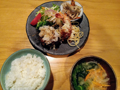 〜前のレビュー〜 ご参考までにランチ3択の最後のを載せました 大根おろしハンバーグと海老チリフライときんぴらです メインがダブルで味も良し! お味噌汁も日によって変えてくださっていますね ご飯のおかわりができ、珈琲(お店の指定はブラック)までは変わらずお値段は1000円です ランチメニューはマグロでいいのが入ればまぐろ丼が増えたりするそう この日も満腹美味ランチでした〜 現在の定休日は月曜で、日曜日は聞いてください(失念m(__)m) お昼は15時ぐらいまでだそう