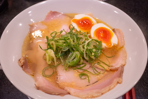 味玉はちょうどいい煮加減で、黄身が流れない程度の半熟、薄切りのチャーシューは柔らかくて、その甘味はスープとよく合う。