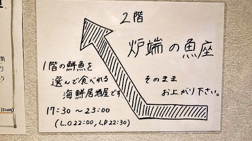 谷町六丁目駅近く。空堀通り商店街の、谷町筋の東側に新しくできた魚介系居酒屋です。一階は魚屋になっていて、二階が魚屋直営の居酒屋になっています。魚座商店(一階鮮魚店)の営業時間は11:30-22:00、炉端の魚座(二階の居酒屋)は11:30-14:00(ランチ)、17:30-23:00(ディナー)となっていますので、居酒屋に行く場合は注意しましょう。一階、二階とも水曜日が定休日です。