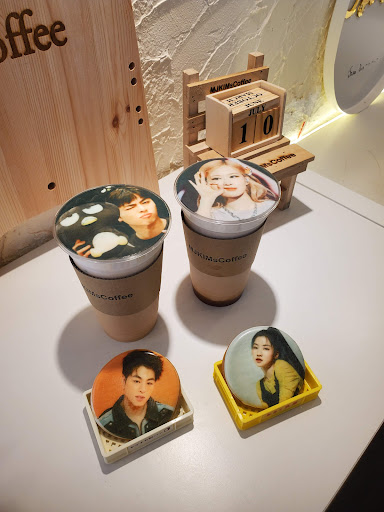 Great cafe for K-pop fans. Accessible even without speaking Japanese. We arrived soon after opening and as such were the only guests for a while. You send the photos you want printed on your cold latte, cheesecake and/or cookie via Instagram. You're encouraged to take a video of the printing process to see it up close, while they played songs of the chosen artist(s). The staff were lovely and enthusiastic. Upstairs is a cosy room where they play the recent music videos of your chosen artists. This room is also set up to take aesthetic photos of your food. There are sticky notes to write messages that you are then able to stick to the wall. The top floor has something similar, but with wooden tags instead of sticky notes. We did both. The food and drinks weren't the best tasting, eg the coffee is from a push button machine, but that's not why you go there. Overall, fantastic experience for K-pop fans....