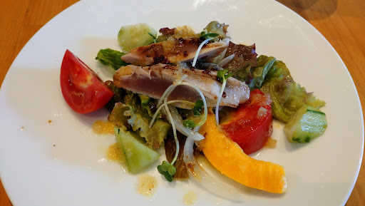 ほどなくして前菜のマグロが乗ったサラダが運ばれてきました。 マグロは大きくて食べ応えがあり、ドレッシングも美味しかったです。 こんなサラダは初めてです。