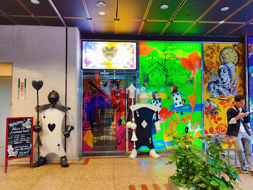 英国文学「不思議の国のアリス」のへんてこキュートなな世界観をベースにおもちゃ箱をひっくり返したようなカラフルな店内には、不思議の国の住人のモチーフも至るところに散りばめられアリスの世界をイメージして作られたイタリアンをベースとする創作メニューとオリジナルドリンクが来客をもてなします。 店内の装飾はもちろん、メニューも、店員さんの接客も『不思議の国のアリス』の世界観にこ セクション毎にテーマを変え、席種も多種多様。