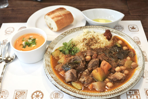 ◆クスクスランチ 価格 税込1,100円 最初に野菜の冷製スープ(ガスパチョ)。 スープはトマトの酸味が効いていて、味わいもトマトをベースとした野菜の複雑な味わい。 個人的な問題ですがトマトは苦手なのでちょっと飲むのに苦労したけど、身体に良さそうなので頑張って飲んだ^ - ^ パンはバリバリっと硬めですが美味しいですね。 オリーブオイルも添えてくれます。 そしてメインの仔羊と野菜の煮込みクスクス添えが登場。 やっぱり旨そう〜! 仔羊の肉は思ったよりたくさん入っていて嬉しい♪ 野菜類はズッキーニ、豆、人参、トマト、大根?が入っていてクスクスが添えてあります。 ほぼ米粒と同じ大きさですが、これでもパスタの一種なのだから面白い♪ パクッと食べると、色んな野菜を使ってるので撮る場所によって毎回違う野菜を楽しめる。 仔羊の肉は柔らか〜く煮込まれていてストレスな無し。 そして煮汁は全ての旨味が出ていてコク深い^ -...