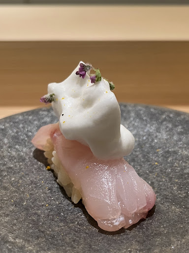 ⚫︎お鮨 ・金目鯛 シグネチャーのお鮨。上からシャンパンで作った泡状の煎り酒と紫蘇の花を乗せて完成。煎り酒は室町時代に醤油がわりに使われてた調味料で、こちらではあえてそれをシャンパンで再現しています。