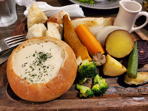 It's a popular spot! Our hostess made reservations thank goodness. We were on our way to fukuoka so had our overnight luggage. The staff tucked them away for us. Being vegan, they didn't have anything on the menu but they accommodated me. They made a vegetable dipping sauce and put it in the bread bowl with vegetables to dip it in. Ohhh my- so oishi!! The sauce was smooth, very well balanced and seasoned, the vegetables were perfectly cooked. It was a lovely lunch. Only thing is, 3 of us got our meals while our hostess waited a long time for hers (which was pasta 😕). The staff was kind enough to bring our bags upstairs for us, for which I was very grateful- the stairs were steep- not uncommon in Japan. I would have struggled with my bag!...