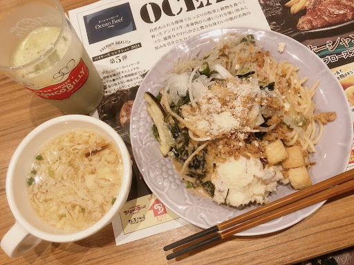 サラダビュッフェは、生野菜数種類と、ちょっとしたお惣菜やパスタもあります。 海藻好きとしては、ワカメがあるのが嬉しいです。 ワカメ以外は気分でいろんな野菜を取り、いつも最後にごまだれとクルトンをのせて食べています。 ドレッシングの種類も5〜6種類はあり、飽きないです。 家でいろんな野菜を買ってきてサラダを作るのが手間なので、手っ取り早くたっぷり野菜を食べたくなったときはブロンコビリーを愛用しています。