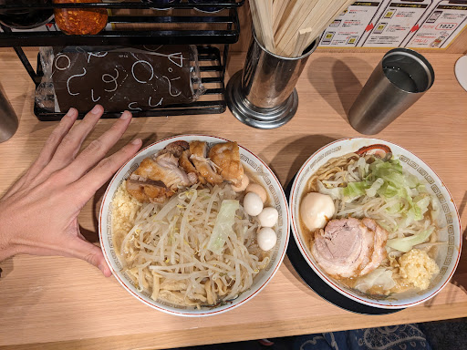 かと言っても最近はタイミングを逃すとこの時間でも少し待ち時間が出てきた 人気なのは間違いないが、なんと言っても1番の売りはボリュームだろう あとは味など好みにカスタマイズできる点が大きい 女性のお客さんもたまーに見かけるがカップル以外は滅多にいない 恰幅のいいお客さんも多いので肘が当たることが多い 新人の店員はテンパっていることもあるが無駄話が減って以前よりは良くなっているがこの日も生卵を忘れるという単純ミスがあり言われるまで気付いていなかった だいたい麺を大盛りにしているのだが、野菜マシでも日によって野菜のボリュームが違うので野菜が多すぎて麺が増えているのかよくわからない チャーシューも日によって脂身が程よい日もあればスカスカのカツヲの缶詰めみたいな日もある しかし塩梅が把握できたら定期的に通いたくはなる(昼ごろは近辺に程よいラーメン屋がないことも理由の一つ)