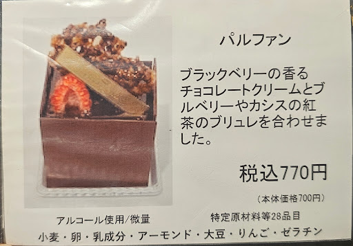 We highly recommend trying the cube-shaped cake, パルファン. It was a delightful experience, especially with the nutty cracker on top. The taste profile was incredibly dynamic, evolving with each bite and chew. Initially, it was buttery, then transformed into a nutty flavor with mild bitterness reminiscent of cacao nibs, but very fine. It concluded with a surprising fruity note.