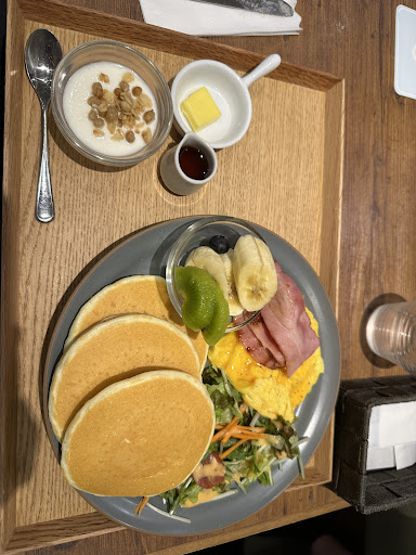 The pancakes came out first after about 30 minutes of waiting. They were good, cream and apples added a nice touch but the pancakes weren’t anything special, reminded me of McDonald’s. Then came one matcha latte, honestly the worst matcha we have had since coming to Japan. Bitter and grainy, stopped drinking after a few sips. Ten minutes later, the basic breakfast came out. Portion sizes were a lot smaller than the menu made it seem, maybe 2 eggs and 2 slices of bacon.