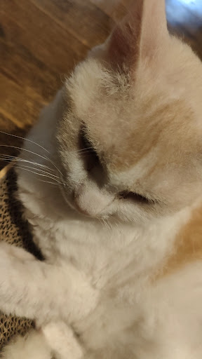 ย ย ย Read moreA very cozy and intimate cat cafe, and I enjoy having gone. The rules are very clear, but one thing to note before you go is to still bring a mask and to not go to other cat cafes before. It's for the cats to stay healthy, so all understandable. The food was delicious as well and pretty affordable. My lap was not selected by the kitties to lay on, but that was just bad luck, all of the other customers had kitties sleeping on them. I was given a chair with one of the cats sleeping in it placed next to me, so I still got to pet a nice relaxed cat. It was clean, there was cat hair on the velvet chair one cat liked, but that's to be expected, it didn't smell or look dirty. It feels like they are well loved and happy and living good kitty lives. There's cat picture books and art, including a nice picture of all 6 cats and the little spoons with your food have their faces on them. They had frilly collars when I went, but seemed relaxed in them. I will go again the next time I...