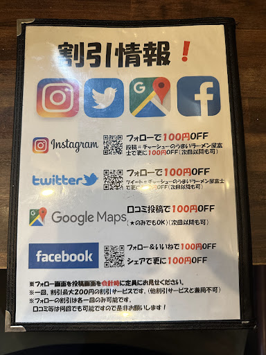 「チャーシューのうまいラーメン屋」。 こんなキャッチーな屋号が気になり、仕事終わりに訪問したのは、横堤にある《チャーシューのうまいラーメン屋富士》さん。 年配の店主さんのワンオペ。 注文はもちろん『富士チャーシューメン』。 チャーシュー推しですからね! にしてもチャーシューメンで1,000円切るのは嬉しいですね! しかも…SNS投稿したりフォローしたりすると最大200円割引だと!!! コスパスゴすぎですやん!! そんなこんなでしばらく待っていると着丼〜