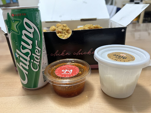 good spot for late-night dining. They serve Korean fried chicken alongside other fried delights such as French fries. You're required to order a beverage other than water, so your choices are a soft drink or an alcoholic drink. It would have been nice to have water with the meal, but at 3 a.m., beggar's can't be choosers . The fried chicken was definitely the highlight, especially the spicy chili version which was...