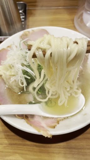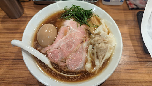 Read more大阪の淀川区(新大阪)にある名店 『ココカラサキゑ』にお邪魔してきました。 数日前にお伺いしてた時 たまたま臨時休業か閉まってたので リベンジに行きました。祝日の20:00過ぎ 無事入店できました。 店の外にある券売機にて食券を購入 『塩魚介のチャーシュー』だったかな? 特製にしたかな? 昨日のことだったが忘れた…w トッピングにワンタンと九条ネギを追加 サイドメニューにチャーシュー丼を! 本日の魚介は『焙煎ノドグロ』 ノドグロは東京のラーメン店で お気に入りの店がありなかなか ラーメン王子のハードルが高いのも 自分で自覚しつつもあえてチョイス! 店内は綺麗なカフェの様な清潔感を感じる 見た目。カウンターの椅子も居心地のよい ラーメン店では珍しい背もたれの あるクッション付きの椅子。 テーブルには七味とペッパー、 スチールカップで冷水をそそぎ 丼着を期待。 チャーシューで美しく覆われた 丼に九条ねぎが盛られてて、太めのメンマ 美味しそうなワンタンが印象的な見た目! 麺は中細麺で程よい加水率の うまうま麺。ノドグロスープは 濃厚でコクのある印象! 綺麗なお味というよりは看板に書いてあった 様にコクや苦味がいい具合にしっかりとしてて 美味しい!東京で印象的だった ノドグロはどちらかというと綺麗な 味だったがこちらは 荒々しさもありながら ノドグロの持つ旨さとクセを最大限に 引き出した感じ! 昔、東京で魚介系ラーメンの制作も少し 参加した事があり 魚介の難しさはわかる えぐみがでない絶妙なところ 苦味やえぐみ、臭みを抑えすぎると 魚介のポテンシャルを消す場合もある ほんとこのバランスを絶妙に表現したスープ スープとマッチしたせいか この日、旨さが目立ったのは チャーシュー! 綺麗なピンクに仕上がった低温調理された レアチャーシューは 肉質がいいのか程よい肉の繊維感と脂身 そのものももつ旨みか?スープによる 香りがプラスされたのか? ここ最近で一番チャーシューの旨みを感じた。 チャーシュー丼のチャーシューもそうだった 細かいブロック状にカットされたチャーシューと スライスチャーシュー マヨネーズを別添えされてるのも嬉しい。 麺とのバランス、魚介のスープの絶妙な メイキング、旨みのあるチャーシュー! 全てのバランスが最高でした。 スタッフさんと店主さんのやりとりが 内容はわかりませんでしたが 声のトーンや雰囲気もとてもよく 店の雰囲気の良さをそこでも感じれました。 ココカラサキも期待して...