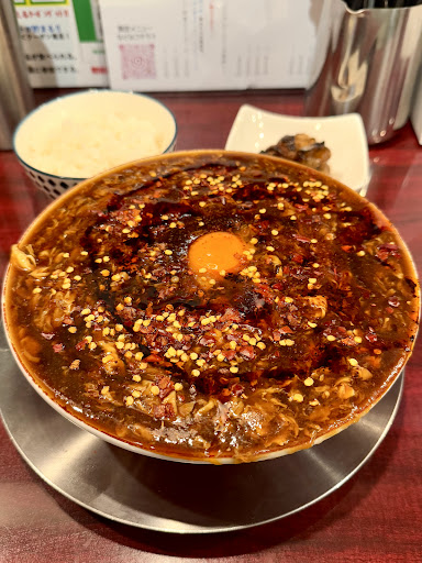 限定告知を見た瞬間、画面に釘付け! 「これ食べたい!」と思い仕事終わりに猛ダッシュして向かった先は、天満橋にある《中華そば辻》さん。 2024年のMy Best Ramenに選んだ『バチ郎』など、とにかくそそられるメニューを多く輩出する辻オーナーが手がける今回の限定は『ジャン麺』。 ジャン麺というのは、高知県四万十町の焼肉屋が考案したというご当地ラーメンで、ニラ、ホルモン、唐辛子などが入り、たっぷりの餡でコーティングしたあんかけラーメン。 しかも、本場を凌ぐ迫力満点でそそられるビジュアル、ひと目見てロックオン!! 到着すると店内満席でしばし待っての入店。 もちろん注文は『ジャン麺』一択! あと、ジャン麺には必須の『ホルモン』と『ライス小』も忘れずに。 しばらく待っていると目の前で丼に注がれていく大量の餡! 溢れんばかりのなみなみの餡がぷるぷると揺れながらの着丼〜