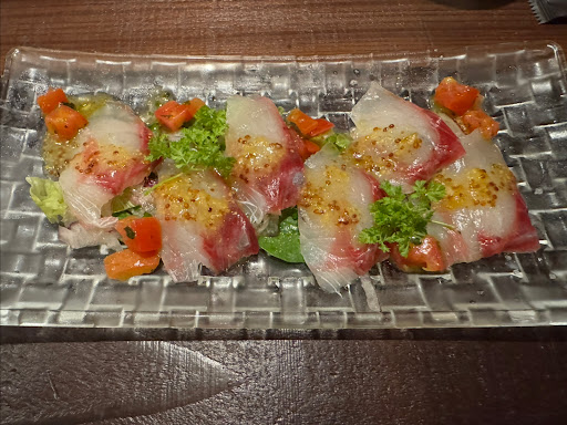 私は迷いに迷った挙句、カルパッチョとアラビアータを注文しました。 まずカルパッチョにかかったマスタードとオレンジのソース。 激うまい。お魚に調和しまくり。 なるほどこれは期待が膨らみますなぁ😋